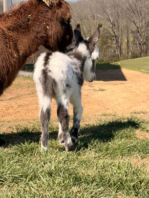 All of our foals prices included gelding (if they are a jack (unless discussed otherwise in depth)), vaccinations, boosters, rabies, negative coggins, several foal de-worming's, several hoof trims, health certificates (if they are leaving TN), etc. We give copies of and handle transferring MDR or ADR papers, and ACOSA papers (if they are spotted) into new owner's name. We also handle our foals A LOT. We pick up their hooves, starting at a day old... teach them to lead, stand tied, do some fun obstacle training, trailer loading, etc. Whether our donkeys go to show homes, therapy programs, pet homes, etc... we find all of this to be very important, to build a strong foundation, for them to be confident in their new homes.